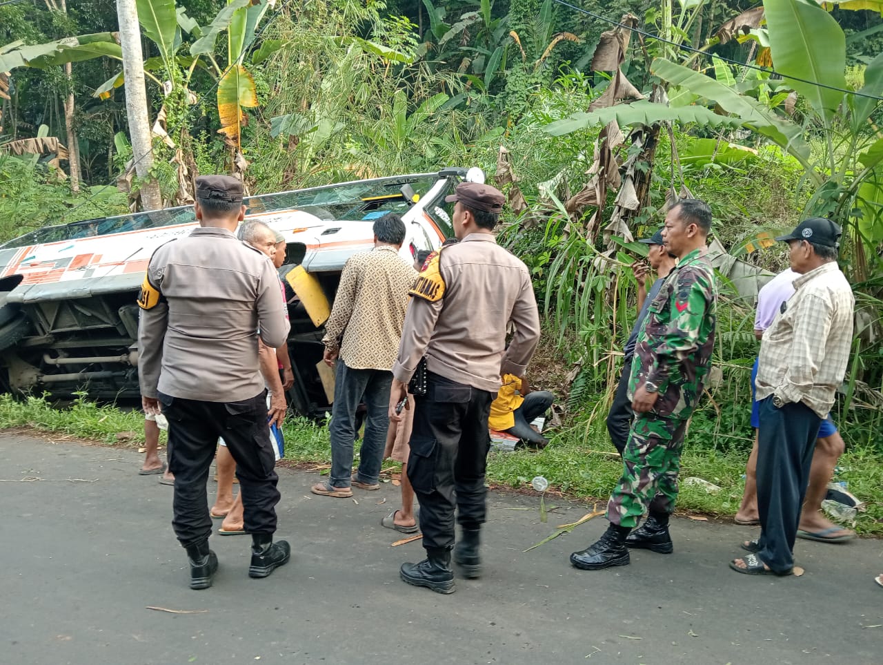 Babinsa dari Koramil 01/Subah, Kodim 0736/Batang, Koptu Agus bersama anggota Bhabinkamtibmas Polsek Subah setelah mendapat informasi langsung menuju lokasi kecelakaan bus yang tergelincir.